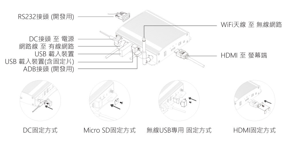 Bizlution 播放器是一個堅固耐用且安裝方便的硬體裝置,支援多種媒體輸出類型。以下將逐步說明零件與規格等(詳細規格請參閱相關產品網頁)