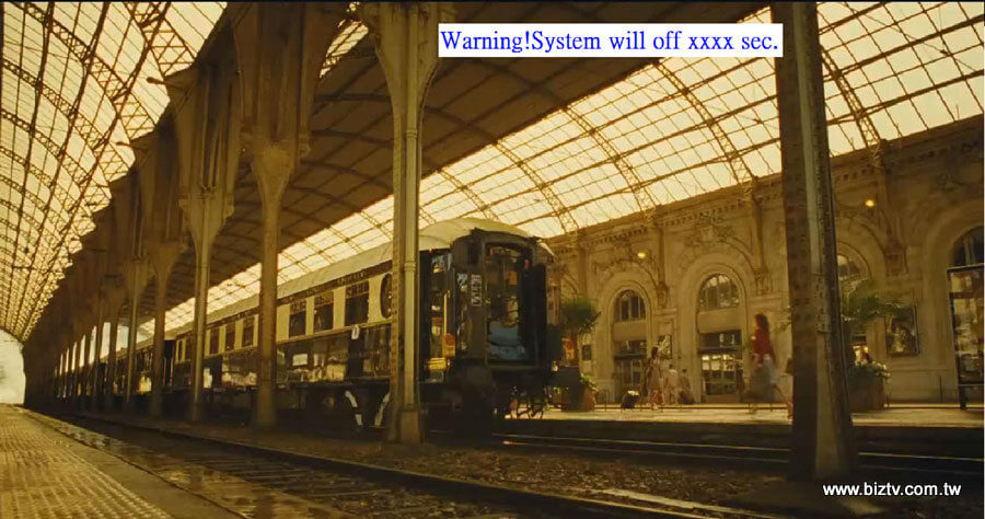同時,廣告機休眠前,螢幕上會顯示即將休眠的提示訊息(Warning! System will off xxxx sec.);如在休眠時段內手動開機,螢幕上也會顯示相同的提示訊息後 (Warning! System will off xxxx sec.),並隨即進入休眠狀態。
