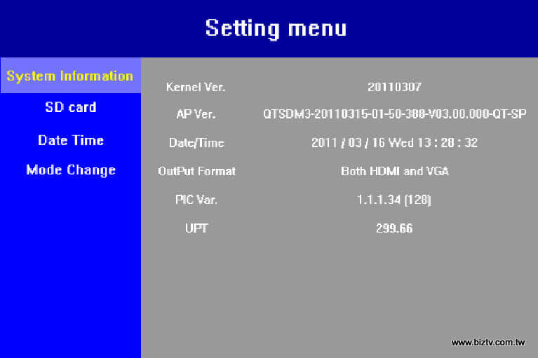 請對準廣告機之紅外線接收端,點選搖控器Menu鍵進入主要功能OSD選單。若您無法順利出現選單畫面,請嘗試貼近距離與角度,或者更換電池再次嘗試進入。開啟Menu後,將顯示Setting menu畫面。畫面上顯示Kernel 版本、軔體版本、目前時間(Date/Time)、輸出類型(Output Type)、PIC版本以及系統開機秒數。